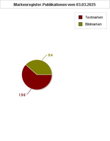 Heute am 03.03.2025 wurden 220 Markeneinträge (136 Textmarken und 84 Wort-/Bildmarken) publiziert.